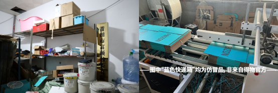 (图:警方在福建某地抓获制造仿冒“得物蓝箱子”违法人员;违法工厂内查获的仿冒“得物包装”)