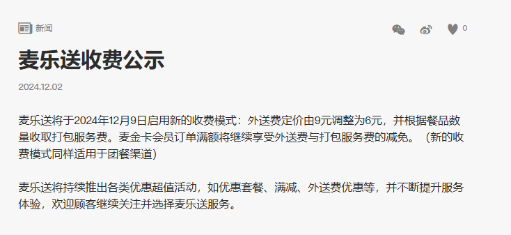 近日,麦当劳宣布下调外送费,由9元调整为6元,并根据餐品数量收取打包服务费。麦当劳此项新规的发布引发了网友讨论。