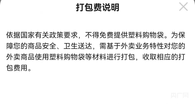 根据外卖平台显示的说明,按照国家有关政策要求,不得免费提供塑料购物袋。为保障商品安全、卫生送达,需要基于外卖业务特性,对消费的人的外卖商品使用塑料购物袋等材料来打包,收取相应的打包费用。这本是合情、合理、合规。
